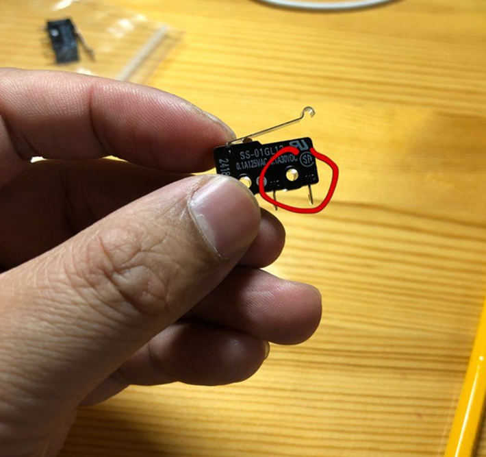 2.把微動開關(guān)把手向下彎曲(具體彎曲多少自己把握,能用為止)。