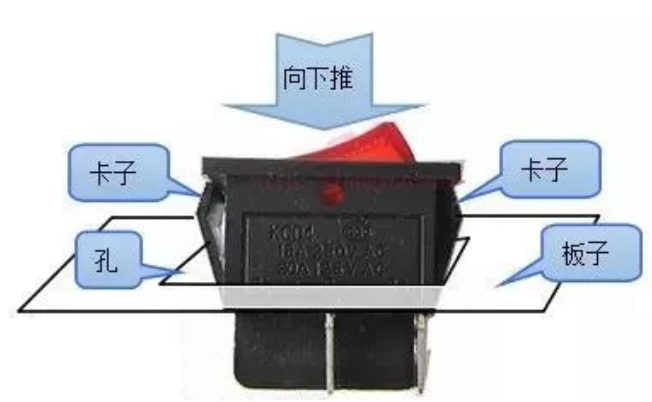 安裝的時候,船型翹板開關(guān)兩側(cè)面有兩個開口卡子,將開關(guān)對準(zhǔn)板子上的孔向下推,等待卡子將開關(guān)固定在板子上即可。