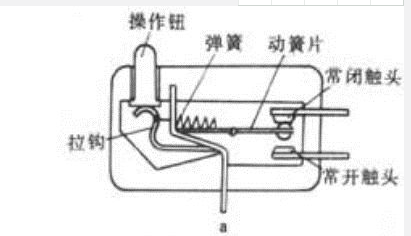 其工作原理是:外機械力通過傳動元件(如按鈕、按銷、杠桿、滾輪等)將力作用于動作簧片上,并將能量積聚到臨界點后,產生瞬時動作,使動作簧片末端的動觸點(常開觸頭)與定觸點(常閉觸頭)快速接通或斷開。當傳動元件上的作用力移去后,動作簧片產生反向動作力。當傳動元件反向行程達到簧片的動作臨界點后,瞬時完成反向動作。微動開關的觸點間距很小,具有動作行程短、按動力小、通斷迅速的特點。